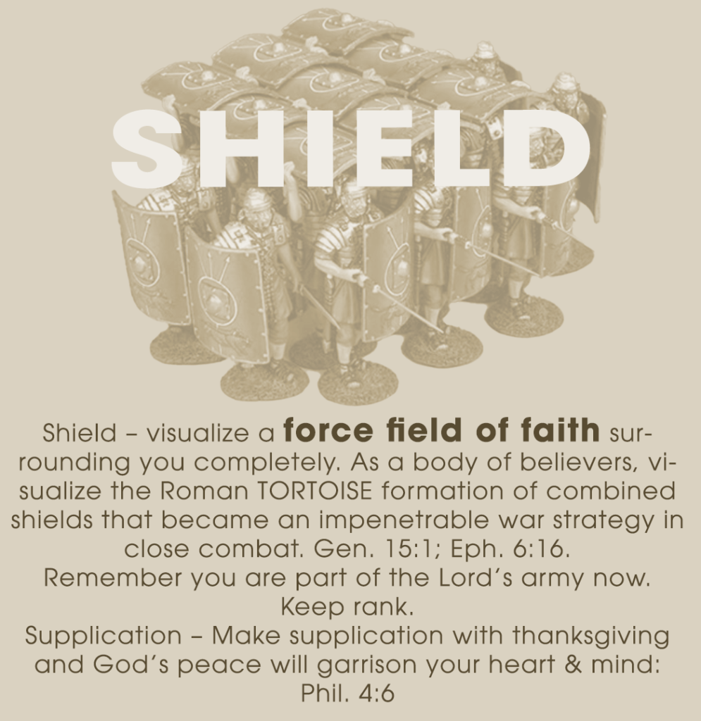 Shield – visualize a force field of faith surrounding you completely. As a body of believers, visualize the Roman TORTOISE formation of combined shields that became an impenetrable war strategy in close combat. Gen. 15:1; Eph. 6:16. Remember you are part of the Lord’s army now. Keep rank.